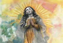 « Un gran signo apareció en el cielo: una mujer vestida de sol, y la luna bajo sus pies y una corona de doce estrellas sobre su cabeza; y está en cinta […]. Y apareció otro signo en el cielo: un gran dragón rojo […]. Y el dragón se puso en pie ante la mujer que iba a dar a luz, para devorar a su hijo cuando lo diera a luz. Y dio a luz un hijo varón , el que ha de pastorear a todas las naciones con vara de hierro, y fue arrebatado su hijo junto a Dios y junto a su trono.» (Ap 12, 1-5).